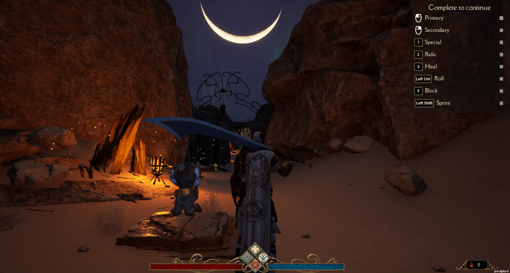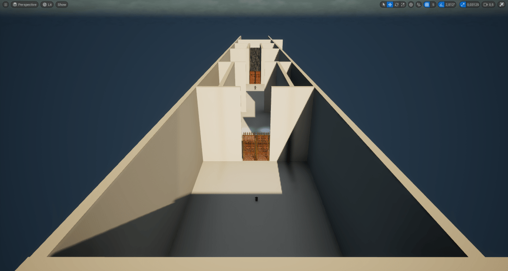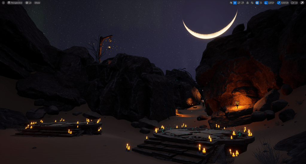 After that it’s time to dive into the engine and start blocking out the level. We wanted to keep the tutorial short and simple and really focus on avoiding too much handholding. Another thing we aimed for was to keep the onboarding area relatively straight, so it would naturally frame the large moon in the night sky and highlight the end goal: the fog door. (Does the drawing above make a bit more sense now?)
