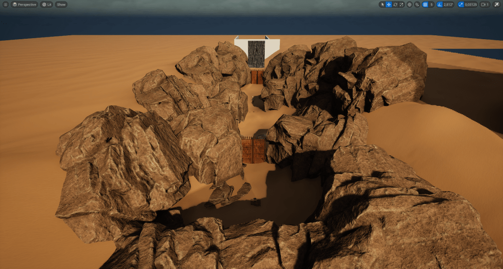 Once we were happy with the layout and the necessary logic was in place, it was time to move on to set dressing the area. We start out with adding terrain and large boulders, using them to define the edges of the playable space and replace the white boxes. While this process is underway, we continue to playtest the level to catch and fix any issues early on.