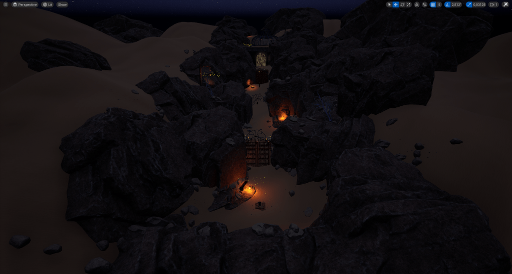 After completing a rough first pass of the set dressing, we moved on to more detailed work. This entails adding foliage (small boulders, rocks, vegetation, etc.) and replacing any remaining placeholder assets. This is also where we get started with a basic lighting pass to make sure everything that’s important is clearly visible.